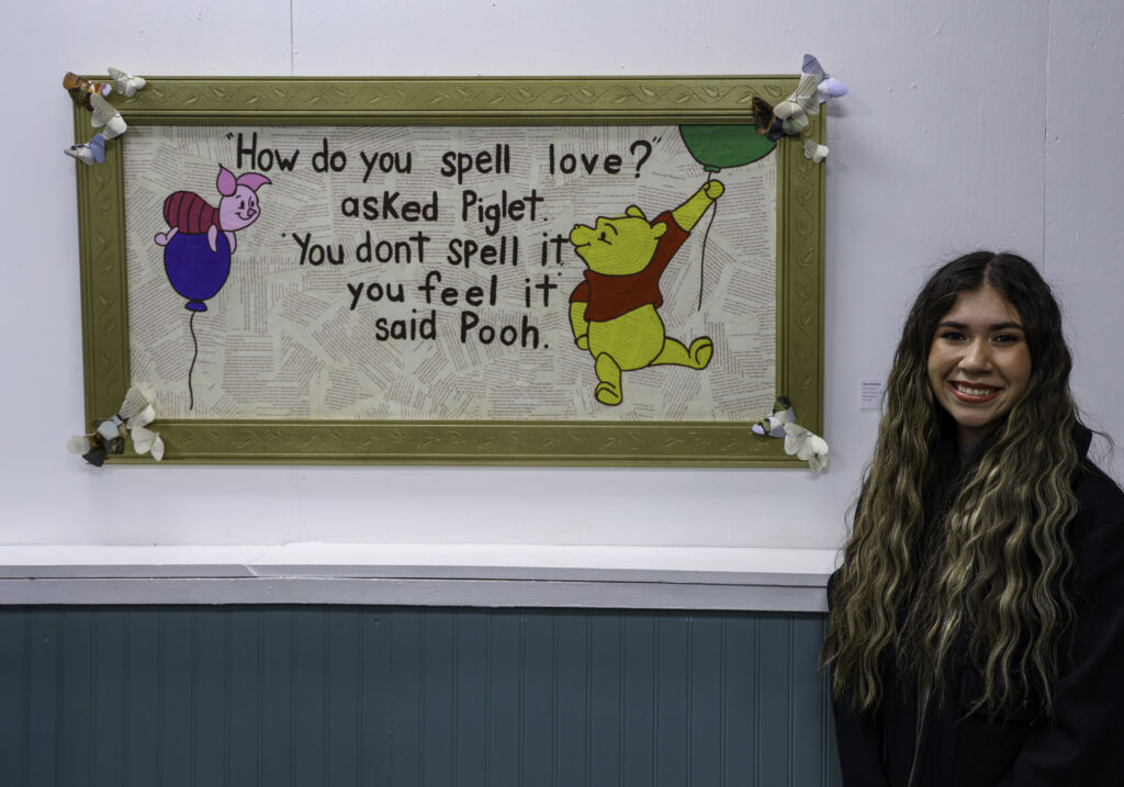 Siena Martinez poses with her mixed-media art piece inspired by Winnie the Pooh. She used paper mache to form the background and cut baseboards to form the frame.