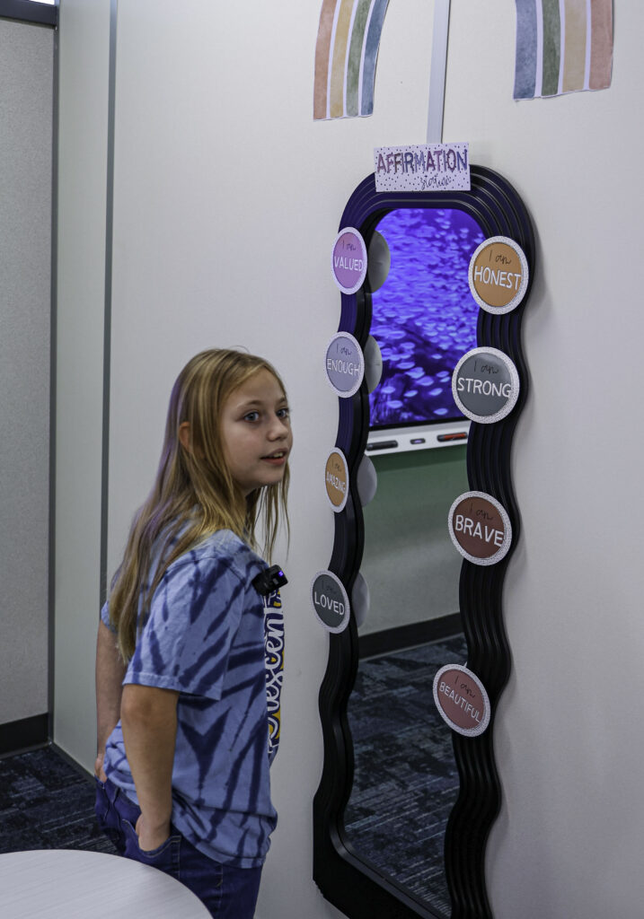 Covey’s third-grade daughter, Hannah, said she likes the positive affirmations wall, where she can look in the mirror and remind herself that she is good enough. She says it helps make her feel better whenever she is feeling sad or frustrated.