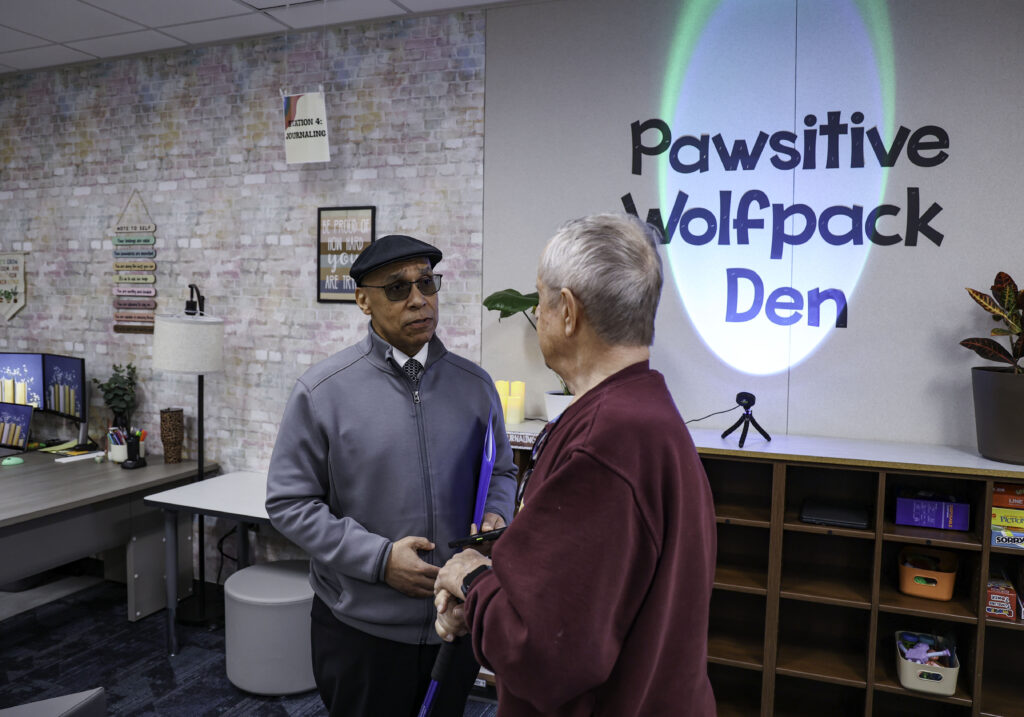 Administrators transformed a classroom into the Pawsitive Wolfpack Den, a cozy, comforting space where students can decompress or self-regulate in a safe, supportive environment. There are two private offices, one for a social worker and another for a psychologist, where they can provide confidential services for students who need extra mental health help. Five stations are placed throughout the room, offering a space for kids to practice positive affirmations, learn mindfulness techniques, explore sensory stimulation, write down their thoughts in a journal, and even get their excess energy out by doing some yoga.