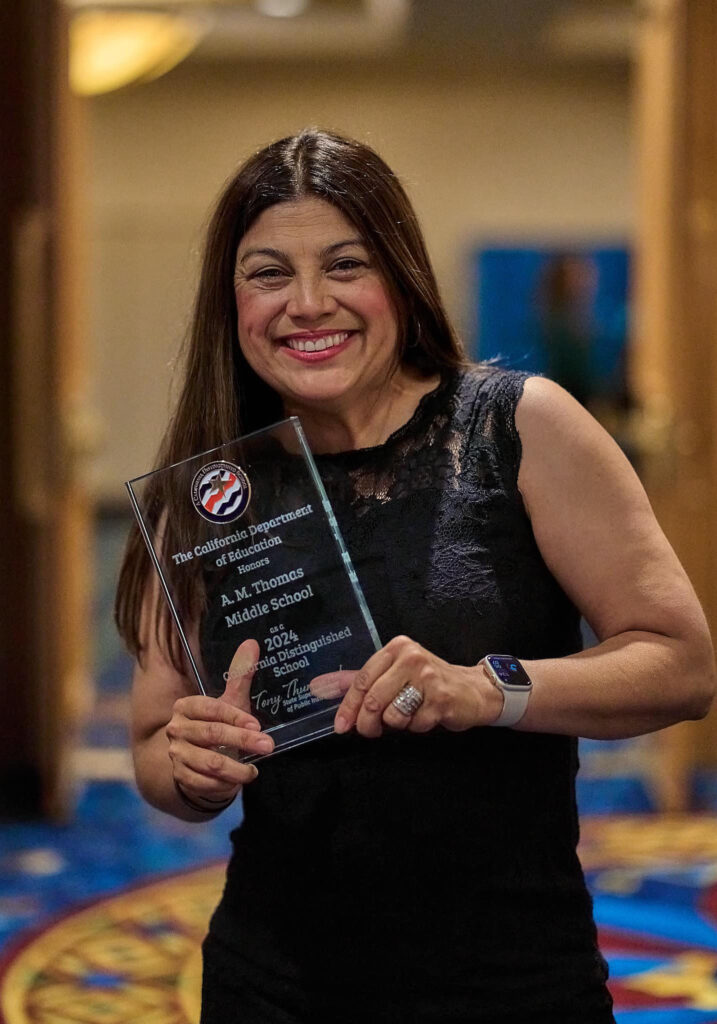 Principal Veronica Sanchez-Gregory poses with a plaque honoring A.M. Thomas Middle School with a California Distinguished Schools Award in 2024.
