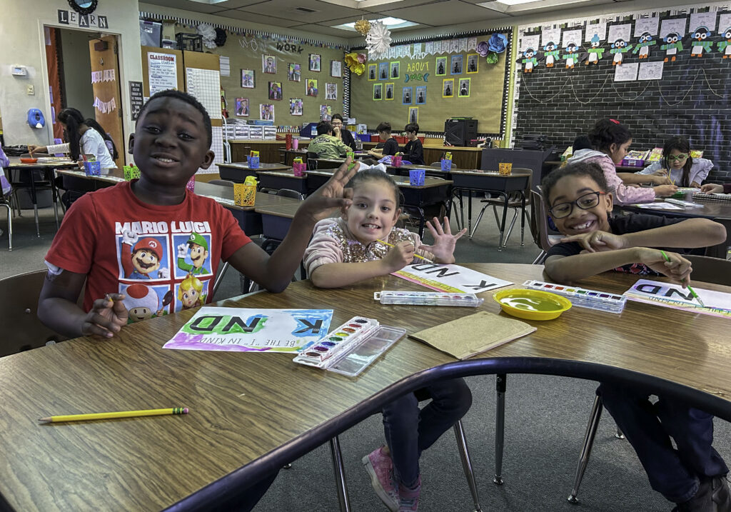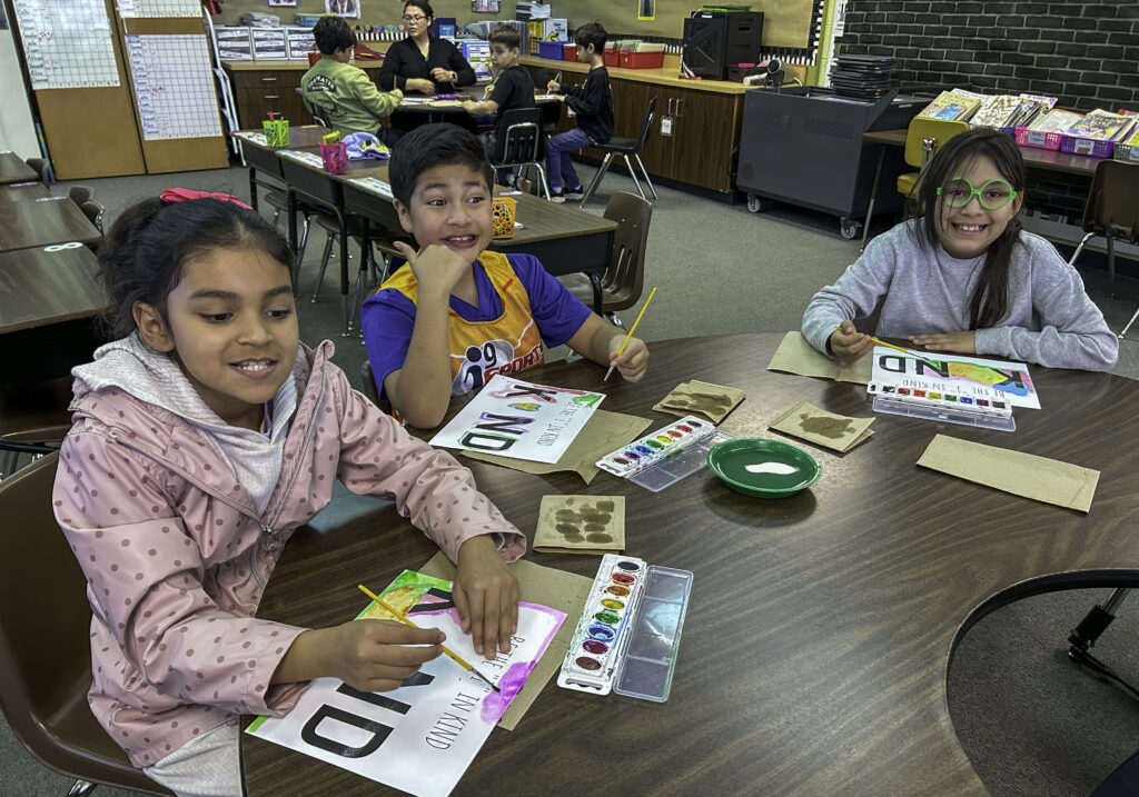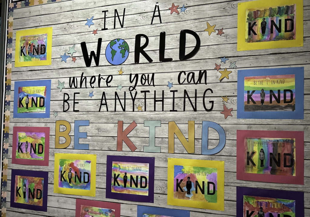 One of the featured projects, titled “I Put the I in KIND,” helped students see themselves as an essential part of creating a caring classroom community. Students used watercolors on paper to create colorful backgrounds, then posed for individual photos that were used to form the letter “I” in the word KIND.