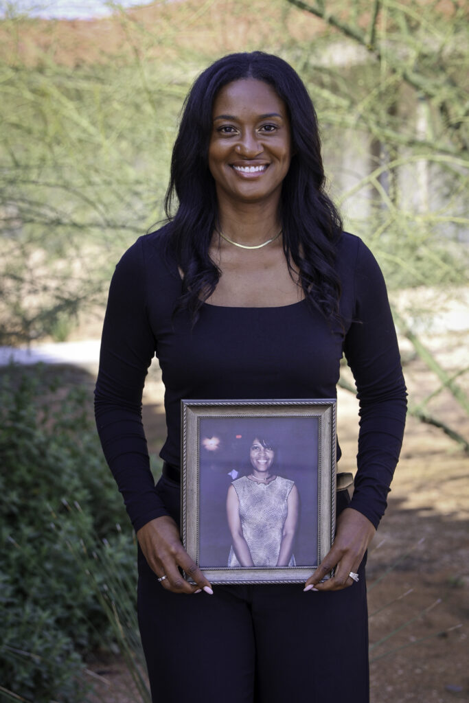 Carla Barrientos poses with a photo of her late mother outside of her office in east Bakersfield.