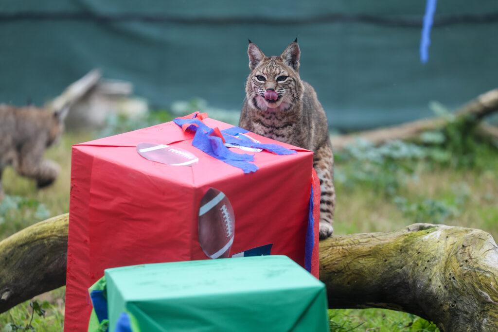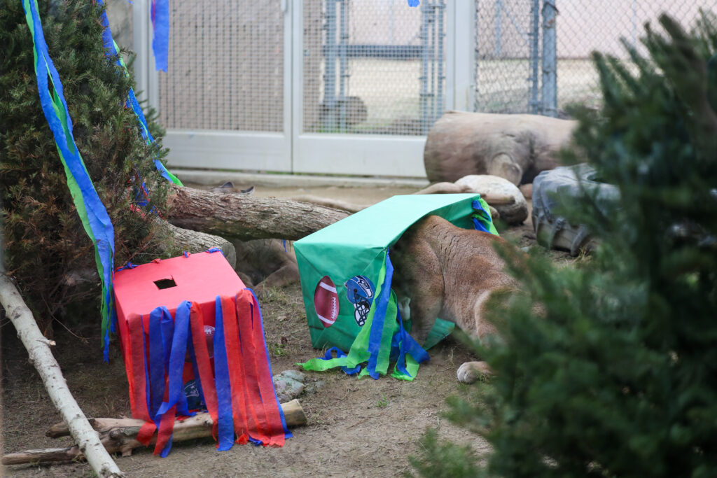 Visitors gathered today at the CALM Zoo for the annual Super Bowl prediction, where the Cats of California once again stepped into the spotlight to forecast the championship outcome. Mountain lions Laurel, Misty, and Sage, along with bobcats Roxy, Rufus, and Coco, took part in the fan-favorite tradition by choosing between two decorated enrichment boxes, each representing one of the competing teams. When the cats eagerly tore into their selected box, the decision was clear — their official pick for this year’s Big Game: the Seattle Seahawks.