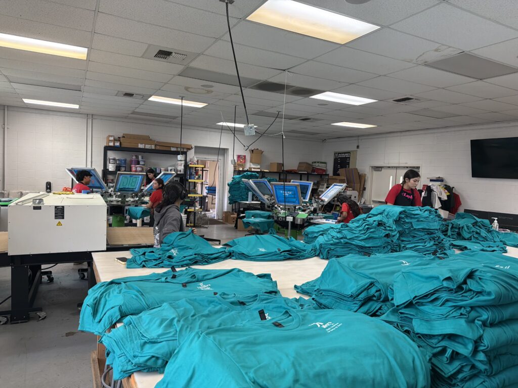Mounds of teal T-shirts stretch across worktables as screens lift and lower in steady rhythm. Inside a busy screen printing shop at McFarland High School, students carefully stack, inspect, and prepare more than 1,350 shirts — each one destined for a student attending the Leaders in Life Youth Conference next month.